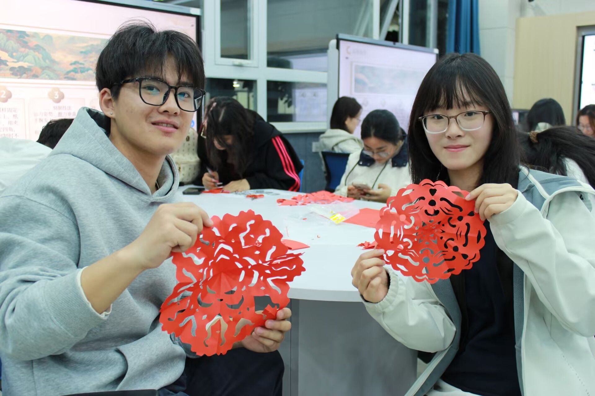 活动最后,同学们纷纷展示自己的纸刻作品,交流创作心得。印染社与青协的成员一同参与其中,大家手持作品合影留念,分享协作的喜悦。一件件带着温度与敬意的纸刻作品,成为校园美育与红色传承的生动注脚。