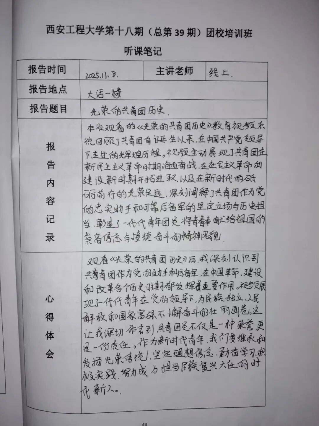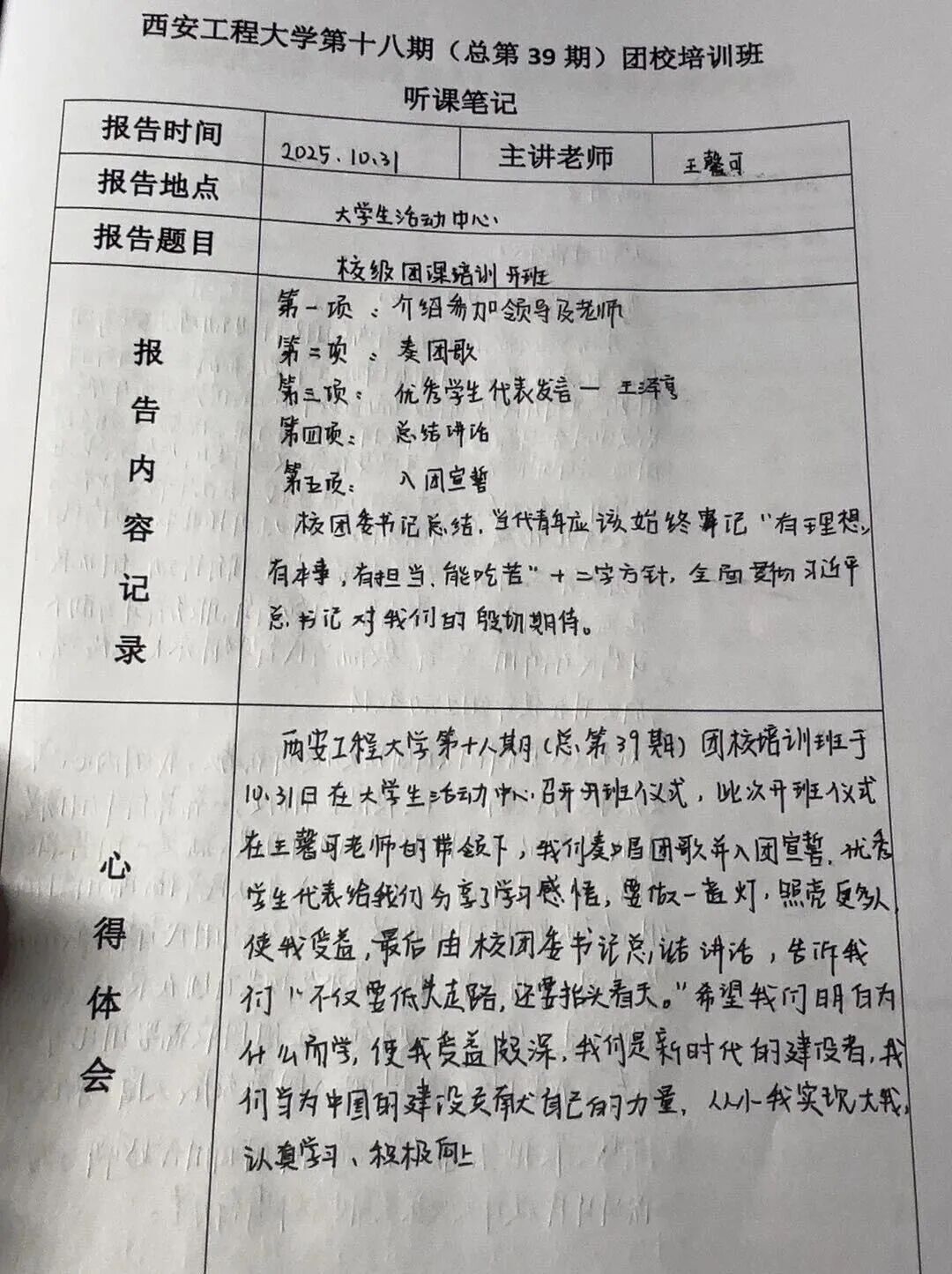 团课虽短,却让我读懂:当代青年的担当,是把所学转化为行动——既要传承共青团的精神火炬,也要在校园里、时代中,做有理想、敢担当的新时代团员。