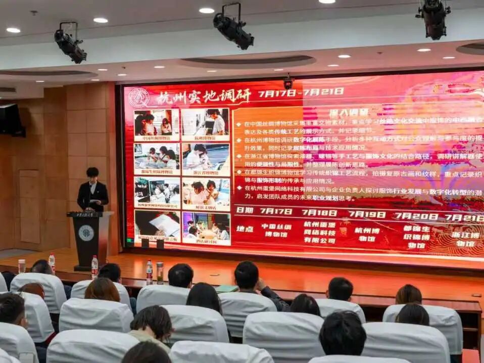 示范宣讲中,纺织学院博士团队“西纺研疆”实践团代表刁宇涵讲述了他们响应国家战略,依托纺织科研底蕴,深入了解新疆棉产业痛点,推动“科创助疆”长效化的实践心路;管理学院赴陕西淳化“渭北果香,联农逐梦”暑期社会实践团的李雨荷讲述团队以白水苹果为切入点,深入行业痛点,向农户传授新技术,为推动地区特色农业可持续发展做出的贡献;服装学院赴浙江杭州“承华夏衣韵,绘数字新篇”数韵绮艺暑期社会实践团李晨昱向大家介绍了团队以文化自信为主题,赴西安、杭州多场馆调研传统服饰,深入剖析传统艺术与现代服饰设计的互动关系,为传统文化的创新性发展提供新思路。