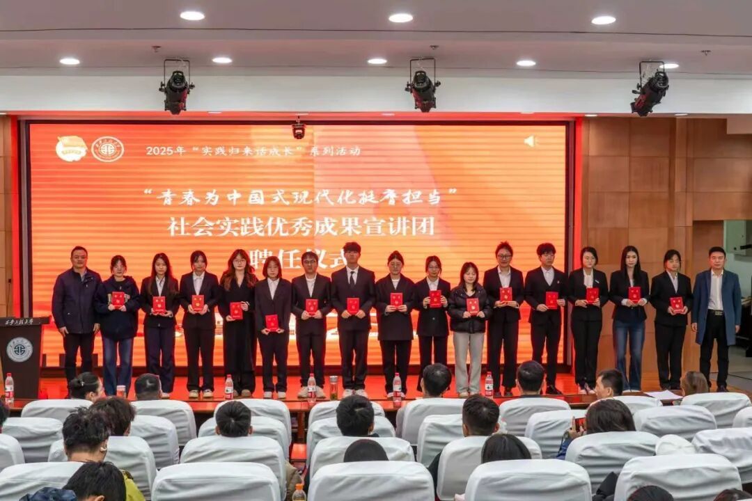 活动第一项,校团委副书记凌旭、李斌为宣讲团成员颁发聘书。本届宣讲团由2025年暑期社会实践优秀实践队中选拔产生,16支宣讲团队涵盖理论宣讲、社会调查、环境保护、科技支农、教育帮扶、文化传承等实践主题。