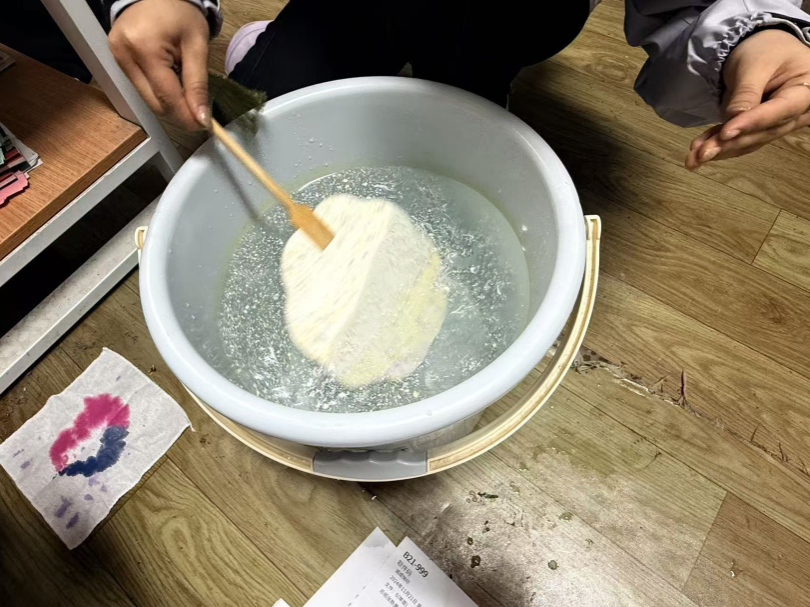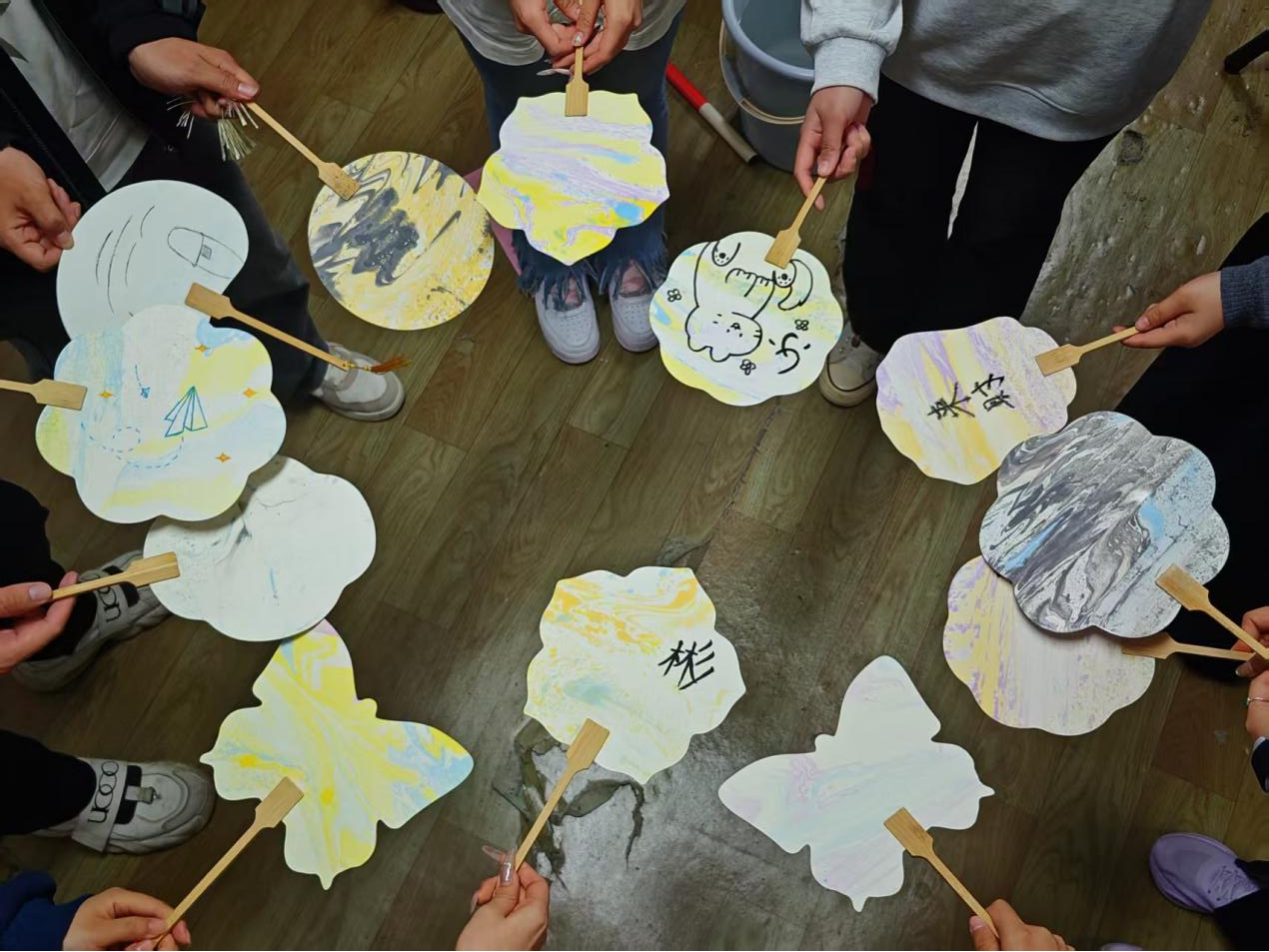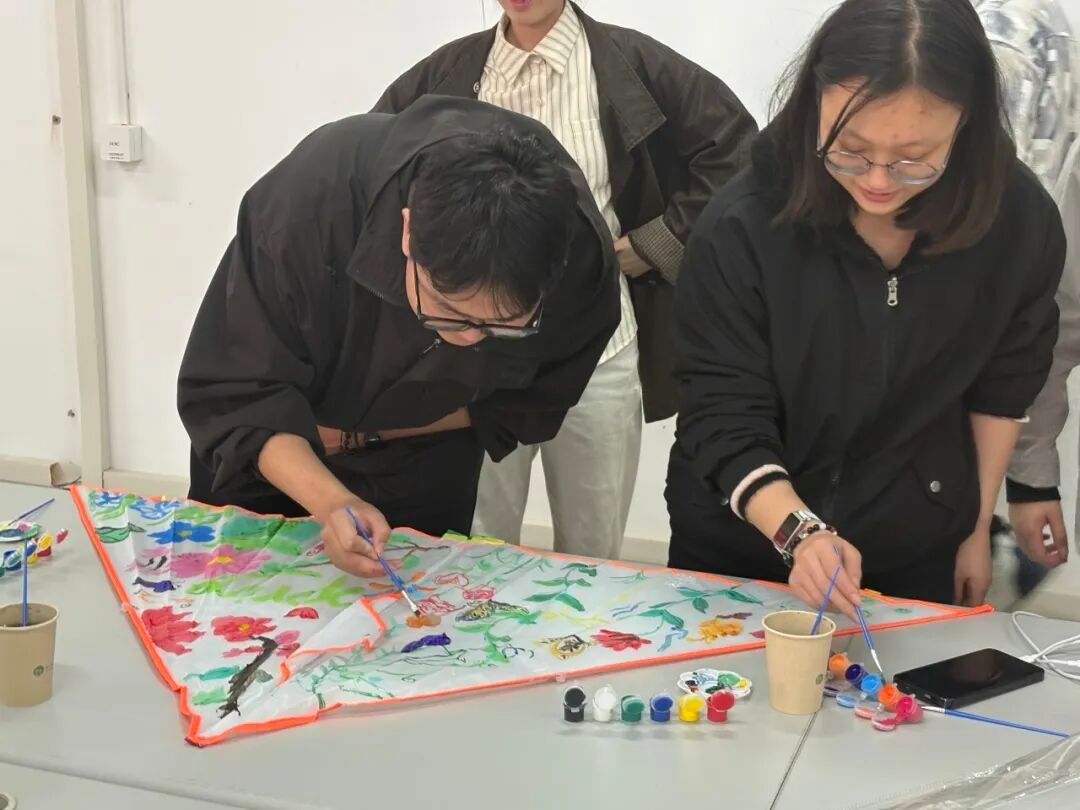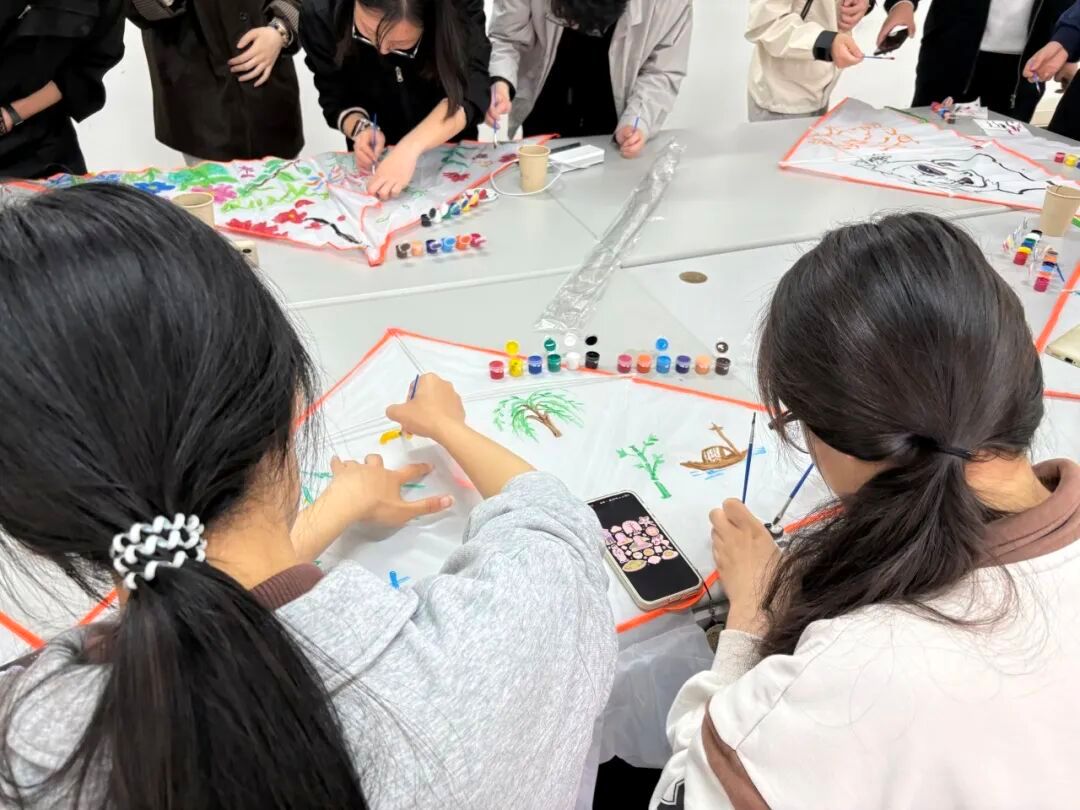 在手工文创环节,大家纷纷化身巧手匠人,分组开启了趣味手工创作。绘画组的同学们用一笔一划描绘出对清明节日的寄托之情,复刻着清明插柳、放风筝的传统习俗;更有同学体验了非遗水拓漆扇DIY,在流动的色彩中晕染出独一无二的春日画卷,让传统非遗文化在青春创作中焕发新的活力。一件件满载心意的手工作品,既是对传统民俗的鲜活传承,也为这个清明留下了独属于青春的纪念。