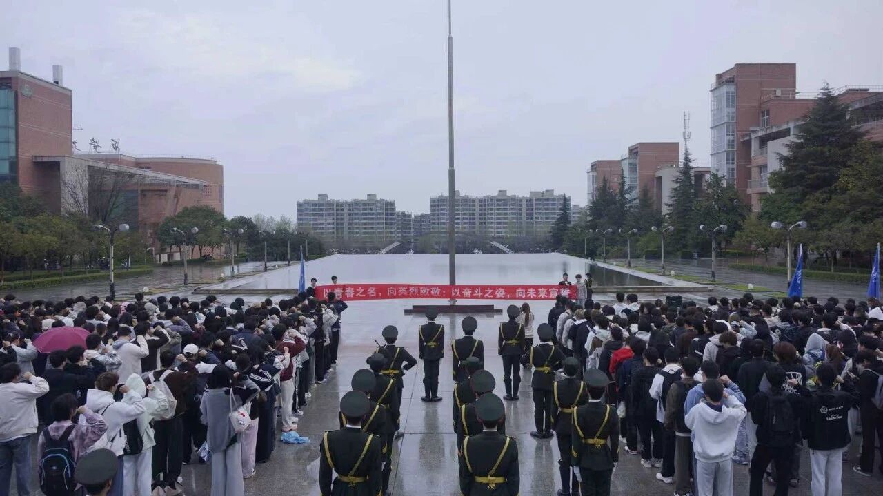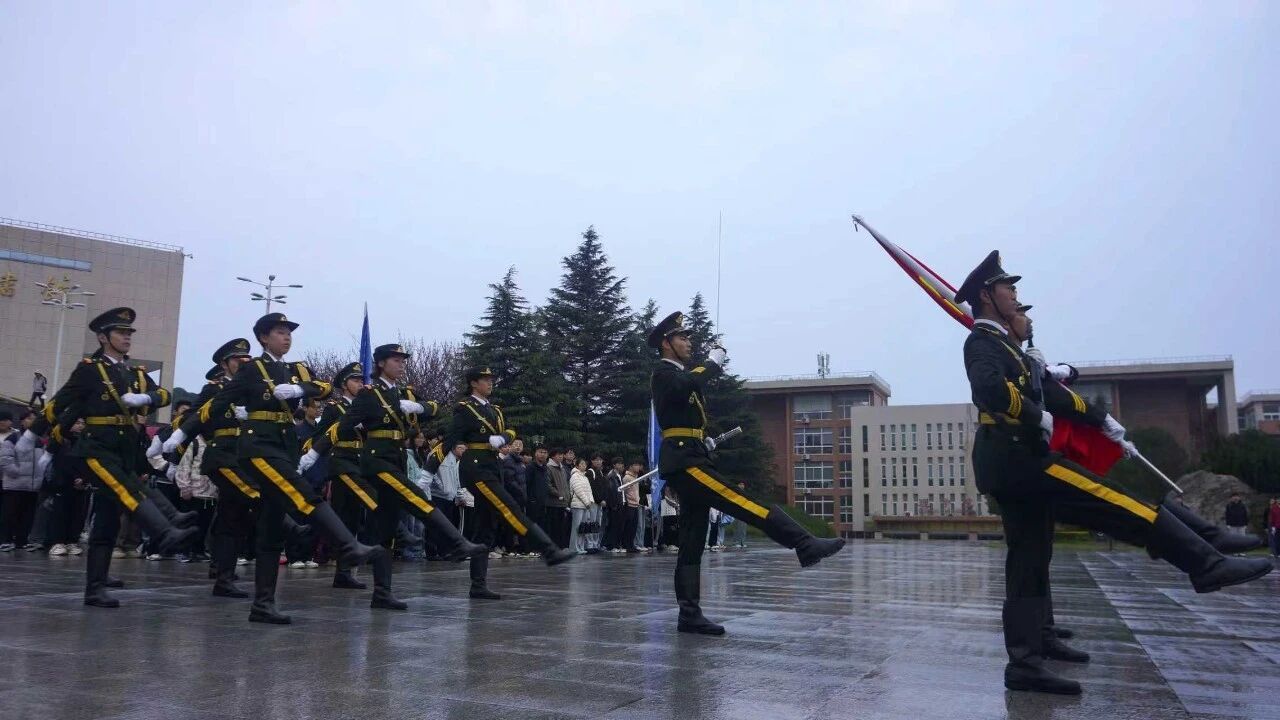 晨光熹微,细雨含情,春日的校园里萦绕着肃穆的追思氛围,学院师生代表着装整齐、精神昂扬,列队肃立,嘹亮的口令划破校园静谧,国旗护卫队队员身着庄重礼服,身姿挺拔如松,迈着铿锵有力的步伐护送五星红旗缓缓入场。雄壮激昂的《义勇军进行曲》响彻校园,鲜艳的五星红旗在全体师生的注目下冉冉升起,全体师生肃立行注目礼,齐唱国歌,浓浓的爱国情怀在每个人心中升腾。