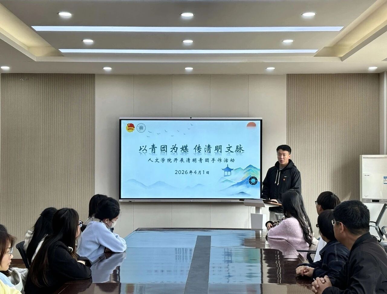 为传承中华优秀传统文化,缅怀革命先烈,厚植青年学子家国情怀,人文学院于4月1日、4月2日,在人文楼326会议室陆续开展青团手作、清明祭英烈两项主题活动,学院党委副书记赵立涛、学工办主任杜静、团委书记刘杨扬、辅导员王菲以及学院教师刘雨彤和部分人文学子参与本次活动,以民俗实践与红色教育相结合的形式,在沉浸式体验中感悟清明文化内涵,传承红色精神。