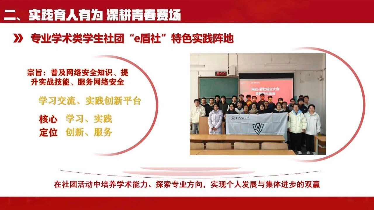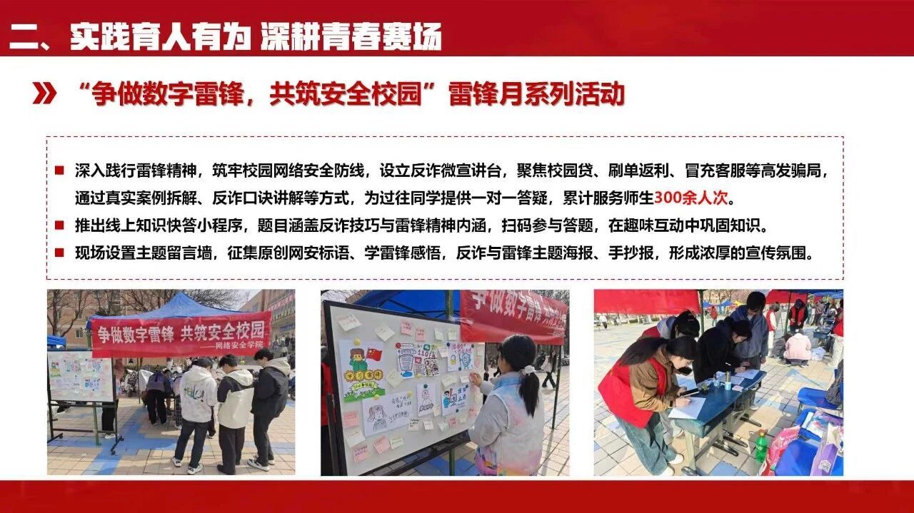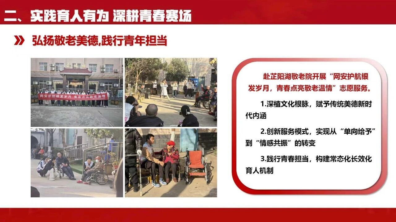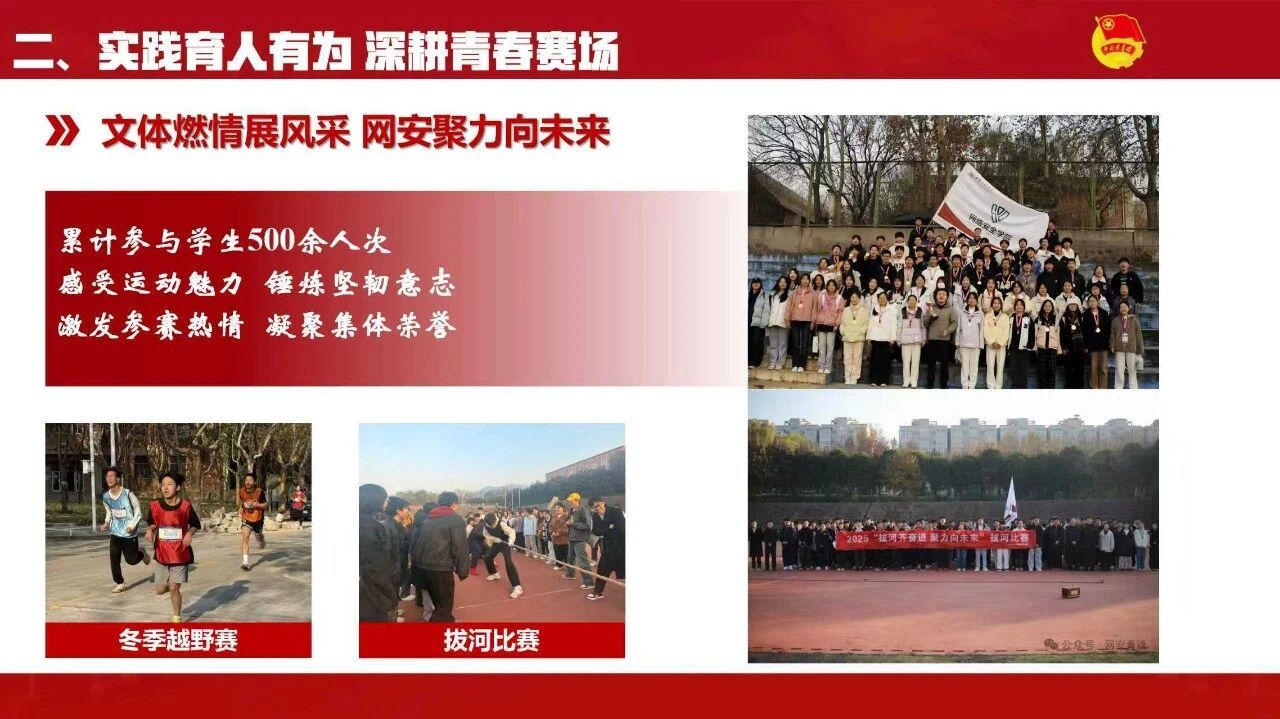 学院团委坚持知行合一,以多元实践平台锤炼学生本领。组织开展“重走延安路,薪火永相传”寒假社会实践,传承红色基因。依托学院青年志愿者协会赴芷阳胡养老院开展志愿服务活动,结合专业为老人讲解手机防诈骗知识、普及扫码支付等实用技能,让网络安全知识走进生活;开展“争做数字雷锋,共筑安全校园”雷锋月系列活动,引导青年学子在志愿服务中传承雷锋精神,提升网络安全素养。同时成立“e盾社”专业学术类社团,组织冬季越野赛、拔河比赛等体育赛事,丰富实践活动形式,让学生在实践中长才干、勇担当。