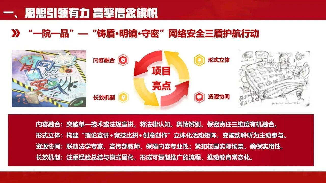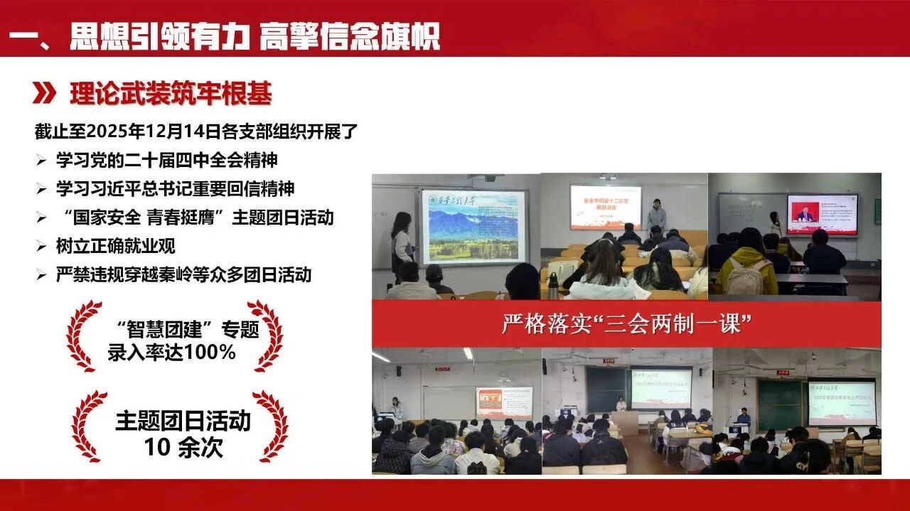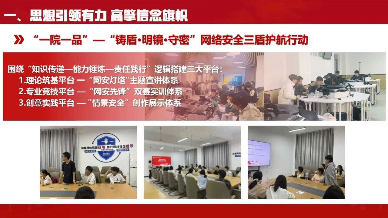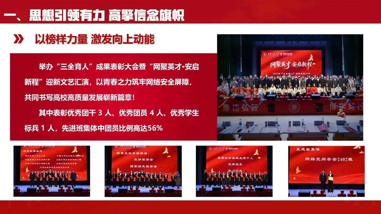 学院团委严格落实“三会两制一课”,组织各支部开展学习党的二十届四中全会精神、习近平总书记重要回信精神等主题团日活动10余次,支部及院级活动完成率、“智慧团建”专题录入率均达100%,构建多维学习矩阵让理论学习走深走实。依托“一院一品”打造“铸盾・明镜・守密”网络安全三盾护航行动,围绕知识传递、能力锤炼、责任践行搭建三大特色平台,以内容融合、形式立体、资源协同、长效建设为抓手形成工作亮点。同时举办“三全育人”成果表彰大会,以各类优秀榜样发挥示范引领作用,激发青年向上动能。