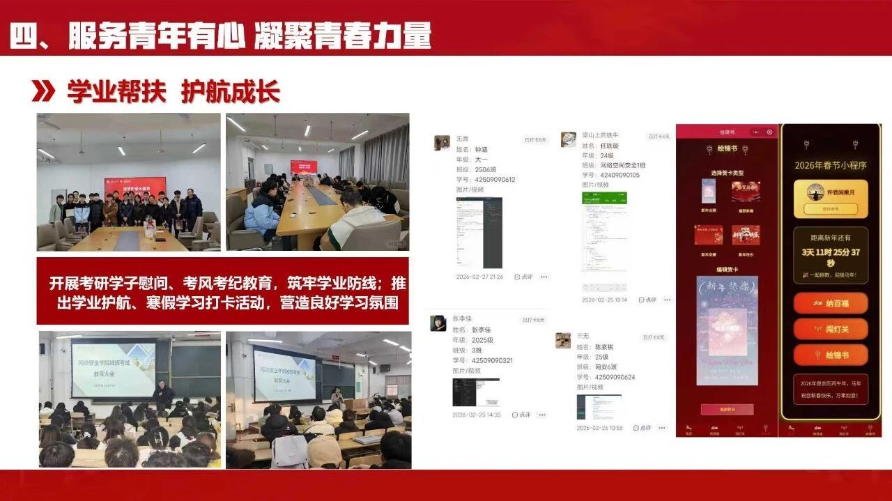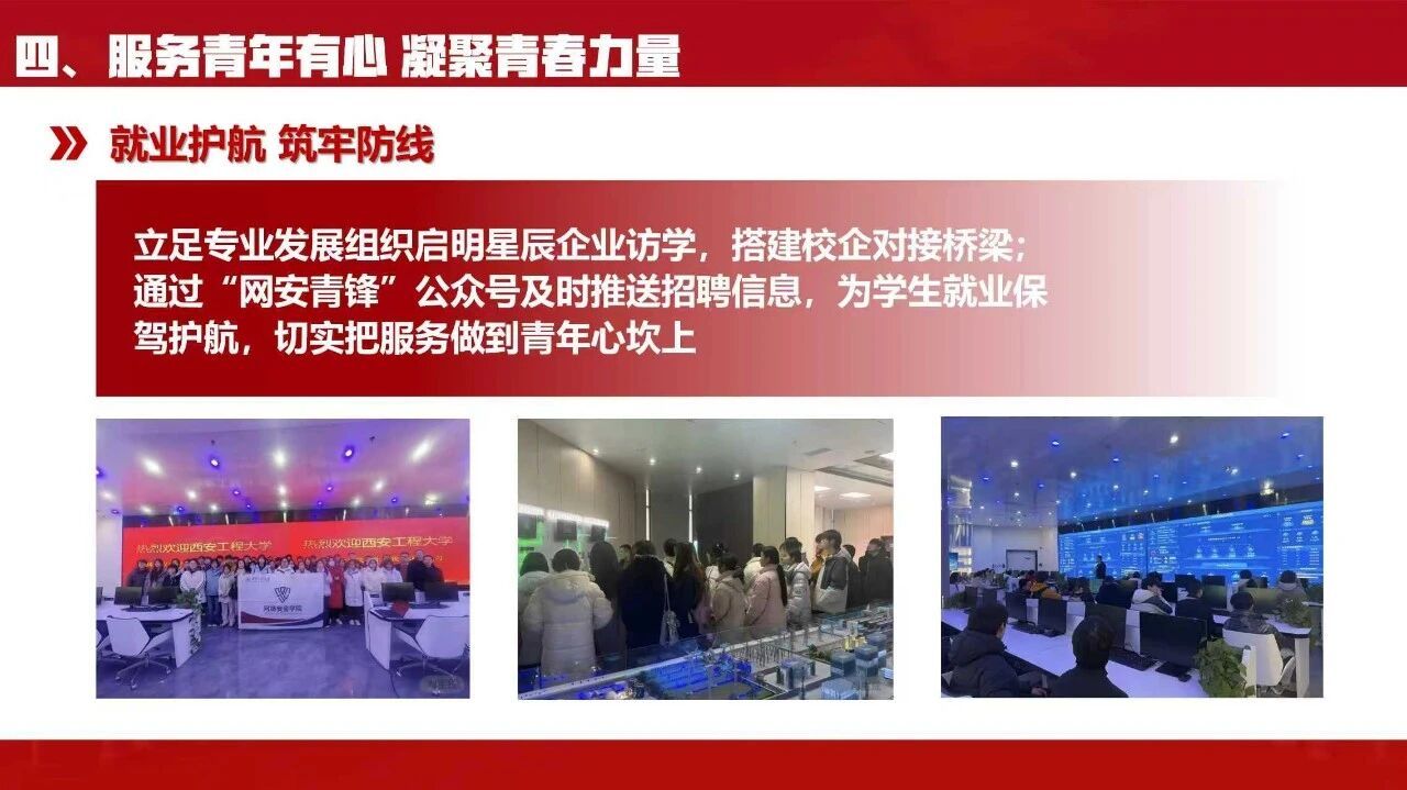 学院团委从学业、就业、成长多维度做好服务工作。开展考研学子慰问、考风考纪教育,推出学业护航、寒假学习打卡活动,营造良好学习氛围。立足专业发展,组织启明星辰企业访学,搭建校企对接桥梁;通过“网安青锋”公众号及时推送招聘信息,为学生就业保驾护航,切实把服务做到青年心坎上。