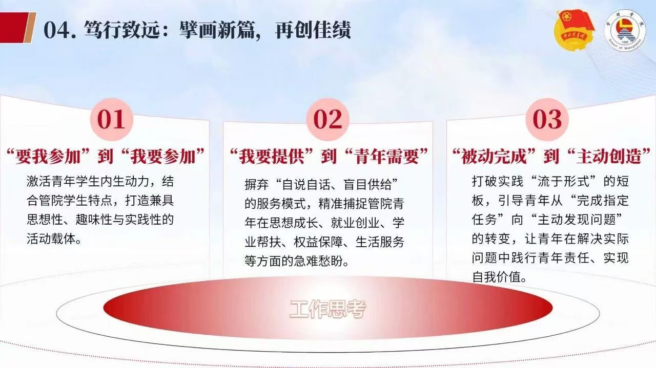 共青团最大的功能,是搭桥。学院启动“英才计划”后,我院团委就主动对接老师和学生,帮着搭平台、促科研。每年坚持举办的创新创业报告会,已连续十余年,推动实践成果转化成科创项目。去年管理学院师生团队在“挑战杯”赛事荣获国家级三等奖。这些数字背后,是学生们一遍遍打磨项目的努力,也是我院团委服务科创的成果体现。