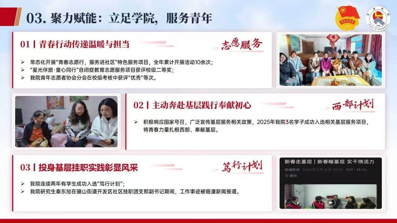 服务青年的过程中,也有越来越多的管院青年开始服务他人。我院青协的“服务进社区”项目,一年开展十多次,服务周边五个社区,关爱自闭症儿童的项目获校二等奖。去年,还有三位同学入选了“西部计划”,其中一位叫赵宗慧的姑娘,现在在四川宜宾的乡镇工作。她说,这半年过得特别充实,收获也很多,更坚定了扎根基层的决心。还有在校生,像秦东旭,今年参加“笃行计划”,在街道社区挂职团支部副书记,他的故事还上了临潼新闻。