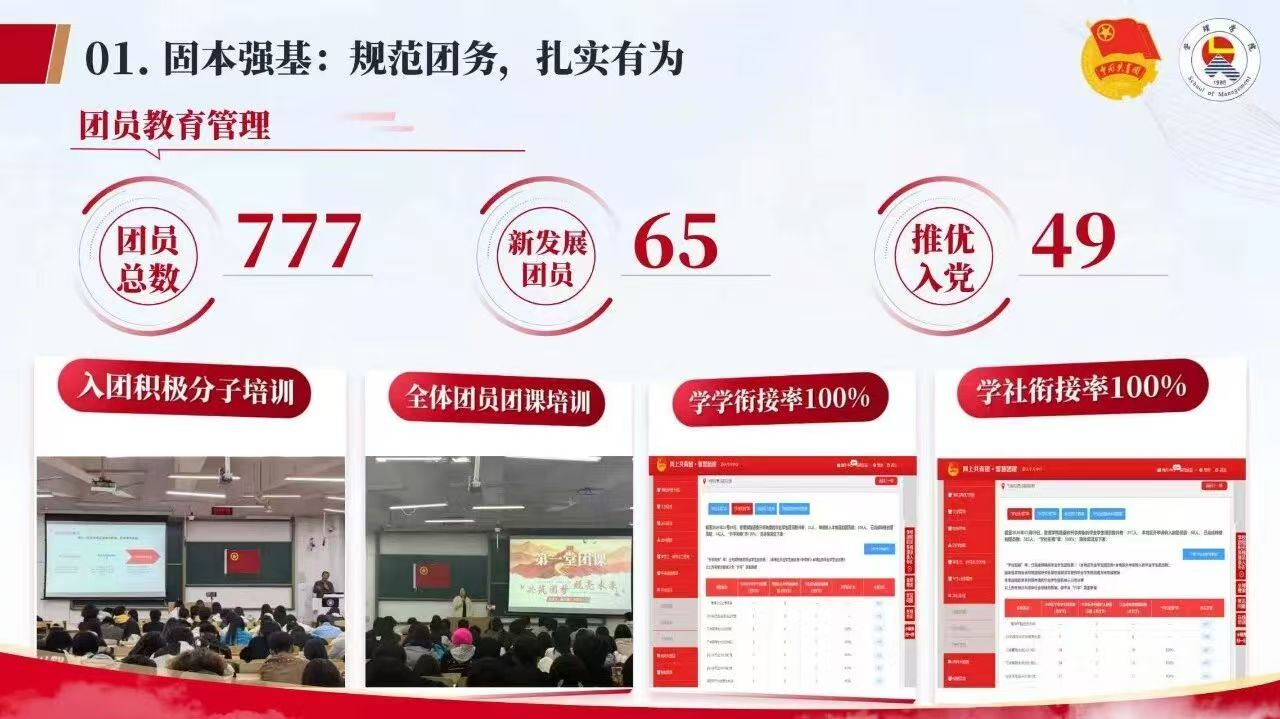 团务工作是团学建设的基础。目前管理学院团委有团员777名,本科生团青比57%,2025年新发展团员65人,推优入党49人,所有流程都坚持规范落地