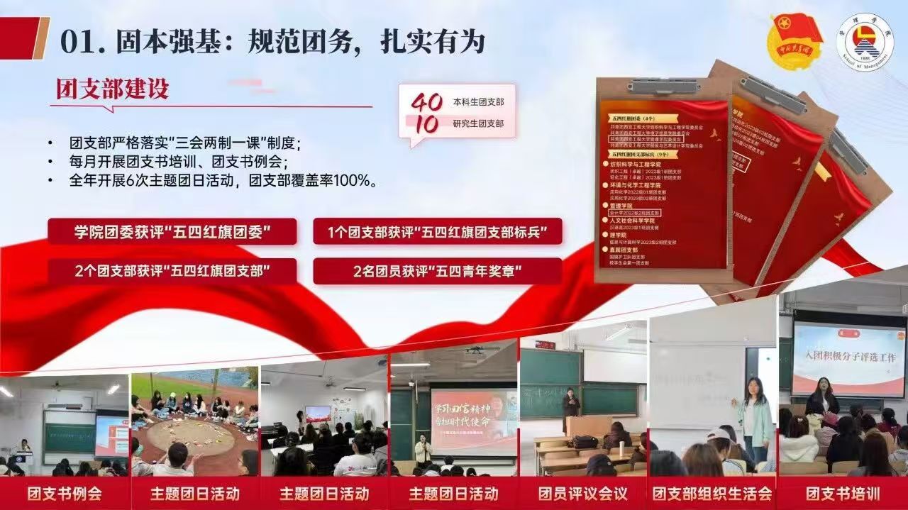 在团员教育上,学院党委副书记带头讲团课,毕业生学社衔接做到100%。支部建设方面,坚持做到“三会两制一课”,每月一次团支书例会。在学院师生共同努力下,2025年管理学院团委获评“五四红旗团委”,1个团支部获评“五四红旗团支部标兵”,2名团员获评“青年五四奖章”。