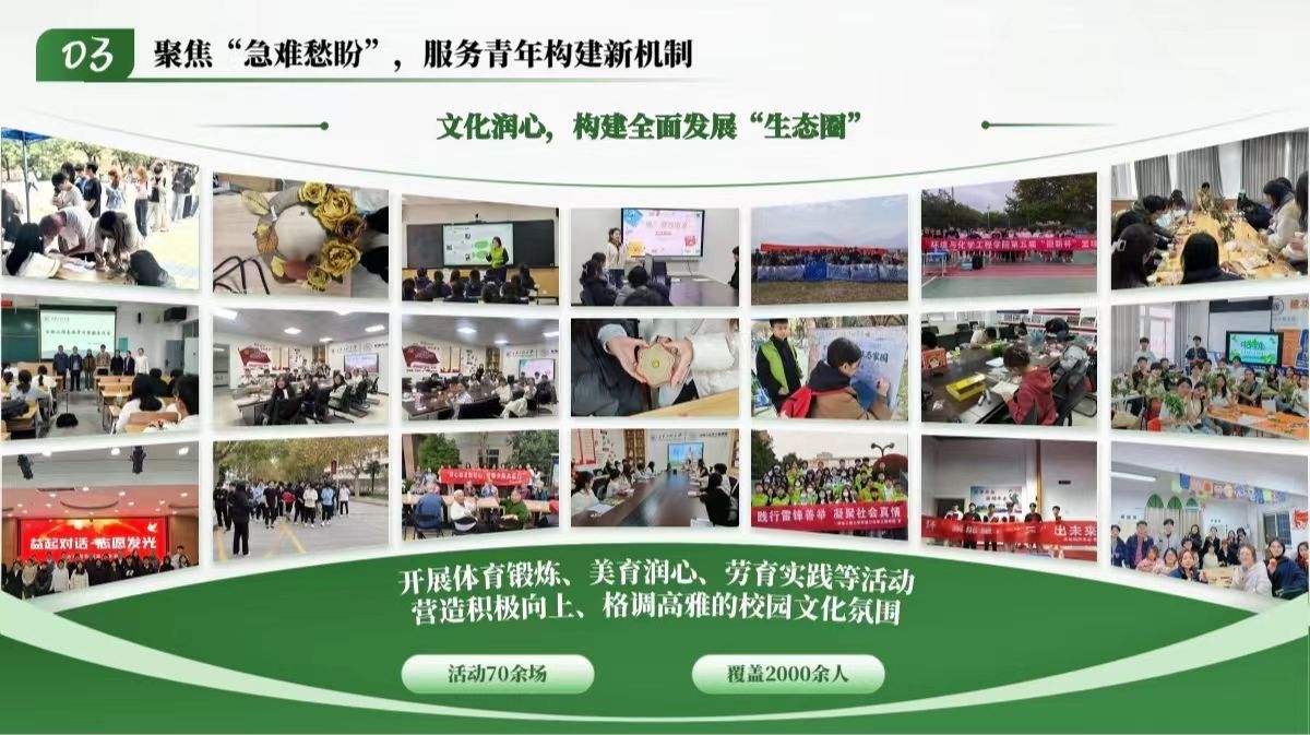 三是活动聚力,绘就协同育人“同心圆”。坚持“党有号召、团有行动”,推动党团活动深度融合、同向发力。集体观看阅兵仪式,开展“爱国光影”展。举办生态文学艺术创作大赛,鼓励学生通过多种形式传播生态文明思想,让思想引领如春风化雨,真正走进青年心坎里。