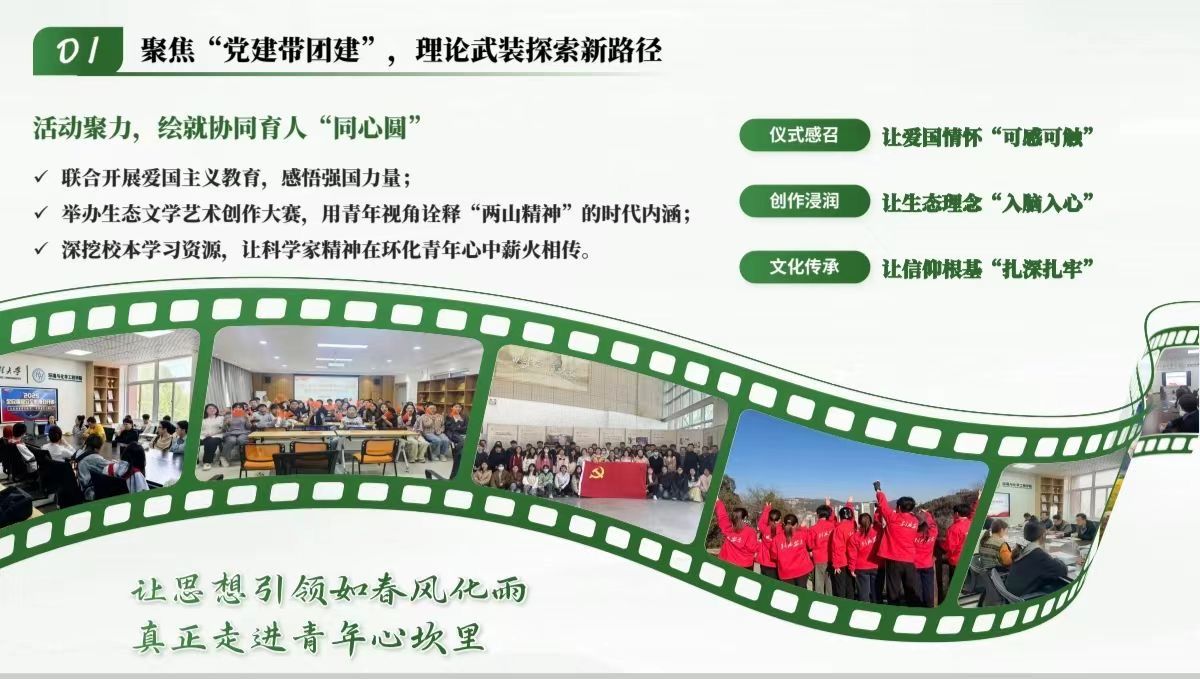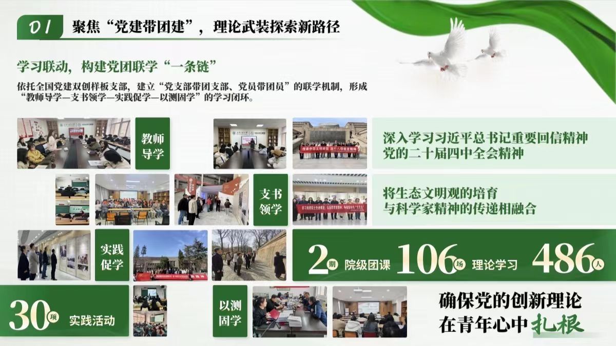 坚持党团联动、以党建带团建,着力破解创新理论入脑入心难的问题。依托全国党建样板支部——绿风环保协会党支部,带动功能性团支部建设,从骨干带动、学习联动、活动融合三个维度协同发力,推动思想引领走深走实。一是学习联动,构建党团联学“一条链”。邀请学科带头人、党支部书记走上讲台,讲授习近平生态文明思想,赴秦岭之谏开展实地研学,全年开展理论学习100余场、实践活动30余次,让党的创新理论在青年心中扎根。