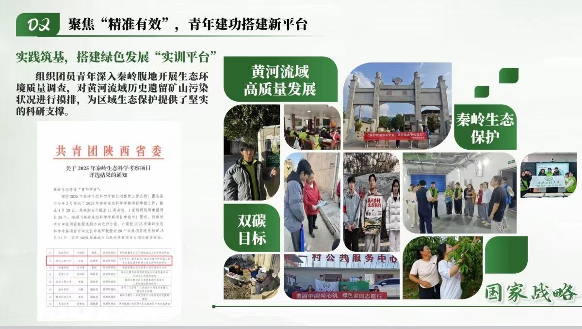 围绕学院中心任务,着力破解青年建功有效发力难问题。一是实践筑基,搭建绿色发展“实训平台”。聚焦国家战略,组织团员青年深入秦岭腹地开展生态环境质量调查,对黄河流域历史遗留矿山污染状况进行摸排。获评2025年秦岭生态科学考察优秀项目,为区域生态保护提供了坚实的科研支撑。