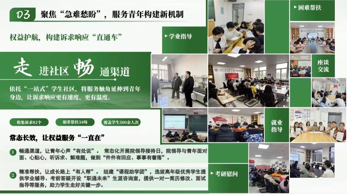 二是权益护航,构建诉求响应“直通车”。依托“一站式”学生社区,常态化开展院领导接待日、“课程助学团”、职业生涯咨询,解决学生急难愁盼问题。