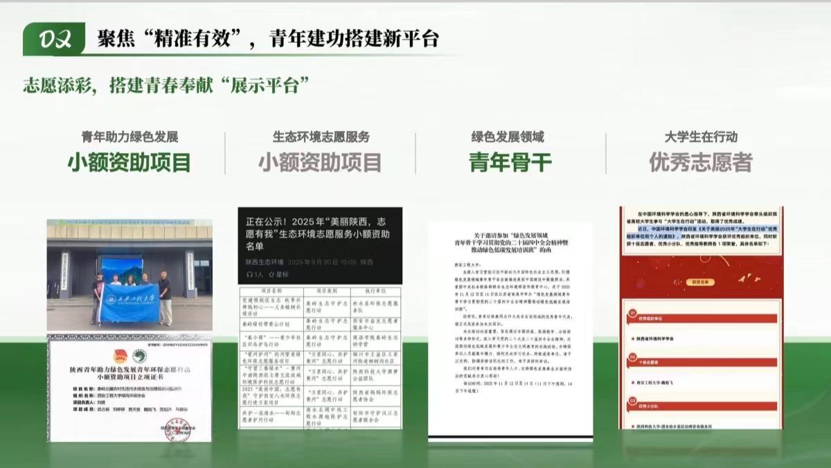 三是志愿添彩,搭建青春奉献“展示平台”。以“绿风”环保协会为依托,持续擦亮志愿服务品牌。协会先后获批2025年“美丽中国,志愿有我”生态环境志愿服务小额资助项目、陕西青年助力绿色发展青年环保志愿行动小额资助项目。成员魏铭飞获“大学生在行动”全国“十佳志愿者”、此外,侯康老师作为协会指导教师代表,受邀参加团中央“绿色发展领域青年骨干培训班”并作交流发言,将我院志愿服务经验做法推向全国。