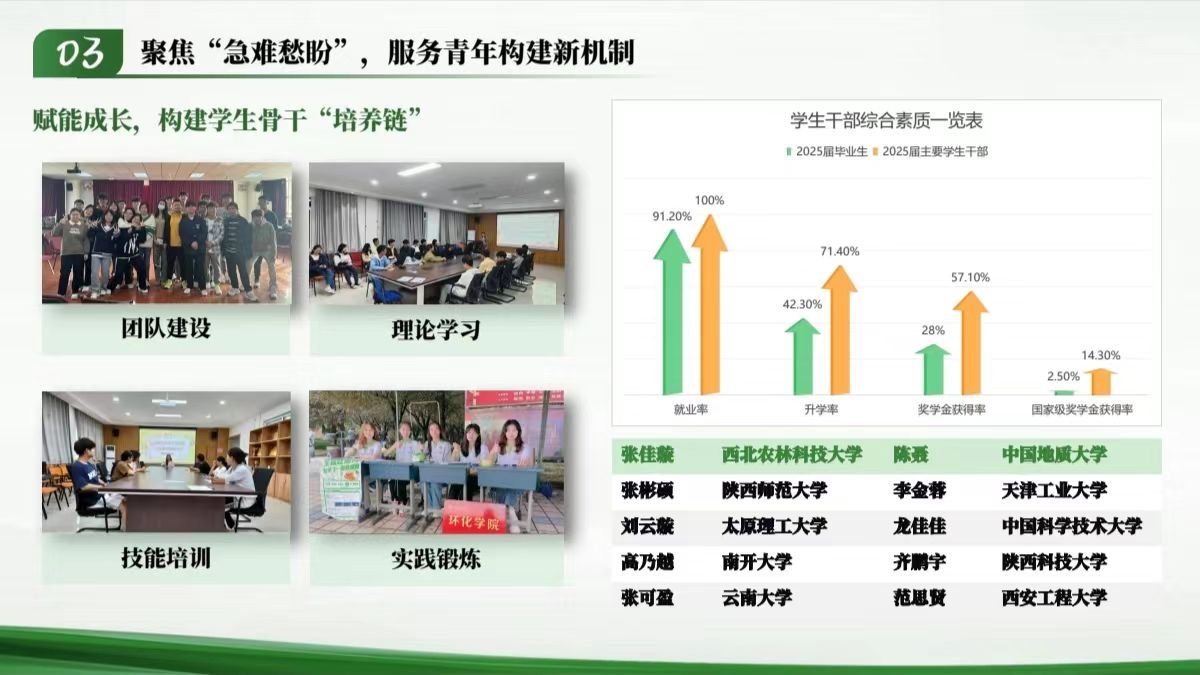 围绕青年需求,着力破解服务青年常态长效难的问题。一是赋能成长,构建学生骨干“培养链”。实施“榜样引领计划”,通过理论学习、技能培训、实践锻炼,提升团学干部综合能力。2025届毕业生中主要学生干部升学率60%,就业率100%,本年度主要学生干部中57.1%获评奖学金,充分彰显了共青团骨干的先进性与战斗力。