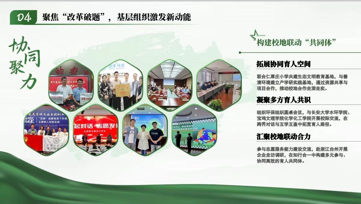 协同聚力,构建校地联动“共同体”,着力破解基层活力持续激发难的问题。与仁厚庄小学共建“青少年生态文明教育实践基地”和“党建+志愿服务”基地,与善清环境建立产学研实践基地,推动校地合作走深走实。主办环保组织圆桌论坛,与长安大学水环学院、宝鸡文理学院化学化工学院开展交流,在互学互鉴中拓宽育人路径,汇聚育人合力。