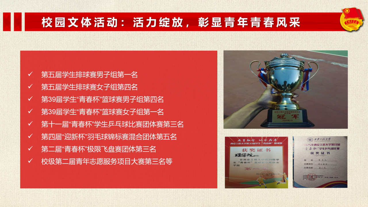 积极承办、参与校级大型文体活动,广泛开展“三走”系列活动,丰富学生文体生活。在各类校级文体赛事中,学院学子奋勇争先、斩获佳绩,先后荣获学生排球赛男子组冠军、“青春杯”篮球赛女子组第一名、乒乓球赛团体第三名等多项荣誉,充分展现了理学青年昂扬向上的精神风貌。