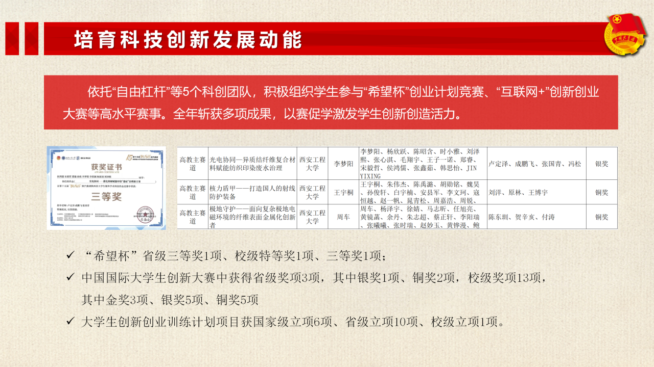 依托“自由杠杆”等科创团队,积极组织学生参加“希望杯”大学生课外学术科技作品竞赛、中国国际大学生创新大赛等高水平赛事。全年斩获“希望杯”省级三等奖1项、校级特等奖1项、三等奖1项;中国国际大学生创新大赛省级奖项3项(银奖1项、铜奖2项)、校级奖项13项(金奖3项、银奖5项、铜奖5项);大学生创新创业训练计划项目获国家级立项6项、省级立项10项、校级立项1项,以赛促学激发学生创新创造活力。