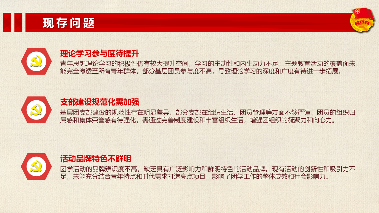 总结全年工作,我们清醒认识到存在的不足:一是青年思想理论学习积极性有待进一步提升,主题活动覆盖面仍需拓展;二是基层团支部建设规范性参差不齐,团员组织归属感需要强化;三是团学活动品牌辨识度不高,特色亮点不够突出。