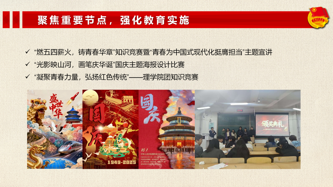 围绕国庆、五四青年节、国家安全日等关键时间节点,开展形式多样的主题教育活动,引导青年厚植家国情怀、树牢国家安全意识,自觉增强“四个意识”、坚定“四个自信”、做到“两个维护”。