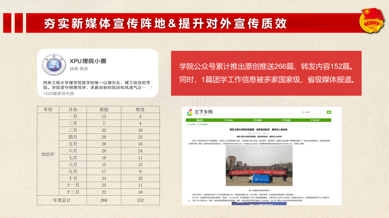 学院团属新媒体平台全年稳定运行,公众号累计推出原创推送266篇、转发内容152篇,及时发布团学动态、传递青年声音。同时,积极向校团委投稿,累计投稿30余篇,通讯稿考核均达合格标准。