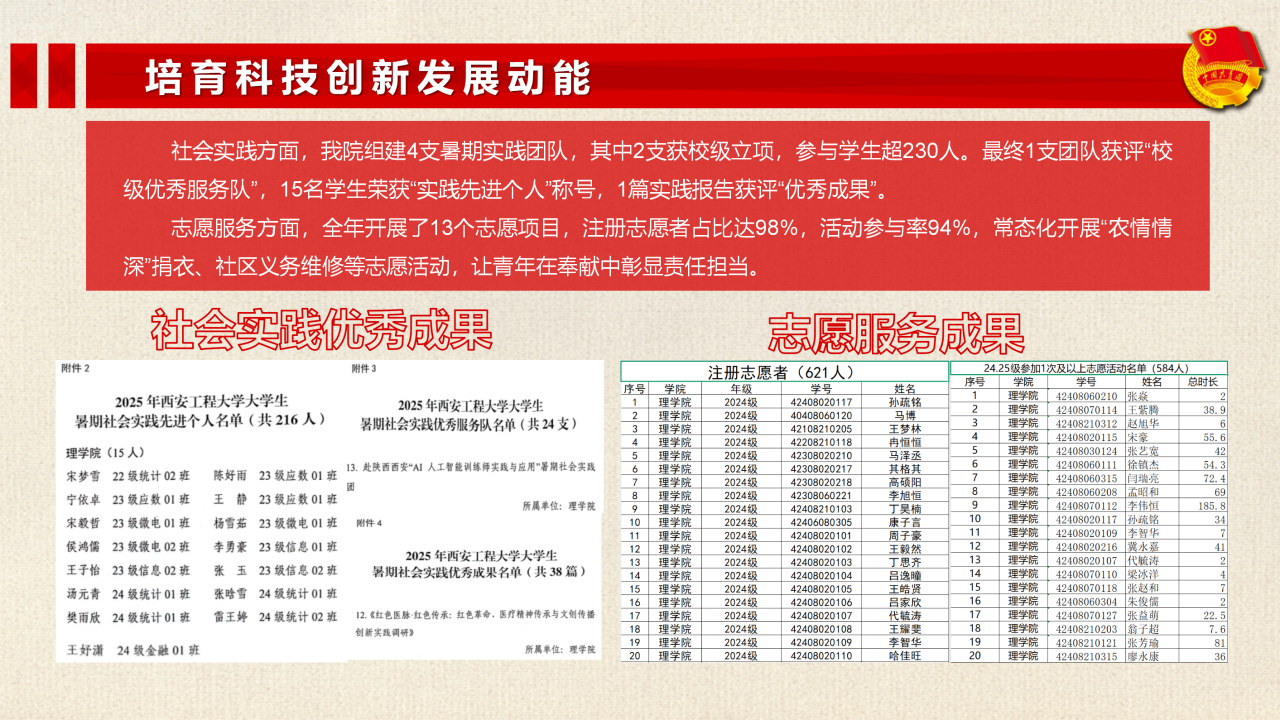 社会实践方面,组建4支暑期实践团队(2支获校级立项),参与学生230余人。最终1支团队获评“校级优秀服务队”,15名学生荣获“实践先进个人”称号,1篇实践报告获评“优秀成果”。志愿服务方面,全年开展13个志愿项目,注册志愿者占比达98%,活动参与率94%,常态化开展“农情情深”捐衣、社区义务维修等志愿活动,让青年在奉献中彰显责任担当。