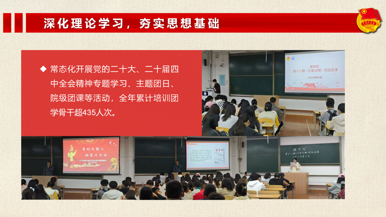 常态化开展党的二十大、二十届四中全会精神专题学习、主题团日、院级团课等活动,全年累计培训团学骨干435余人次,引导青年学子深化理论认知、提升政治素养。
