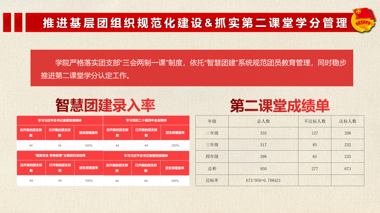 1. 推进基层团组织规范化建设 严格落实团支部“三会两制一课”制度,依托“智慧团建”系统规范团员教育管理,学习录入率达100%。同时,加强学生社团管理,配齐配强社团骨干,引导社团健康有序发展。