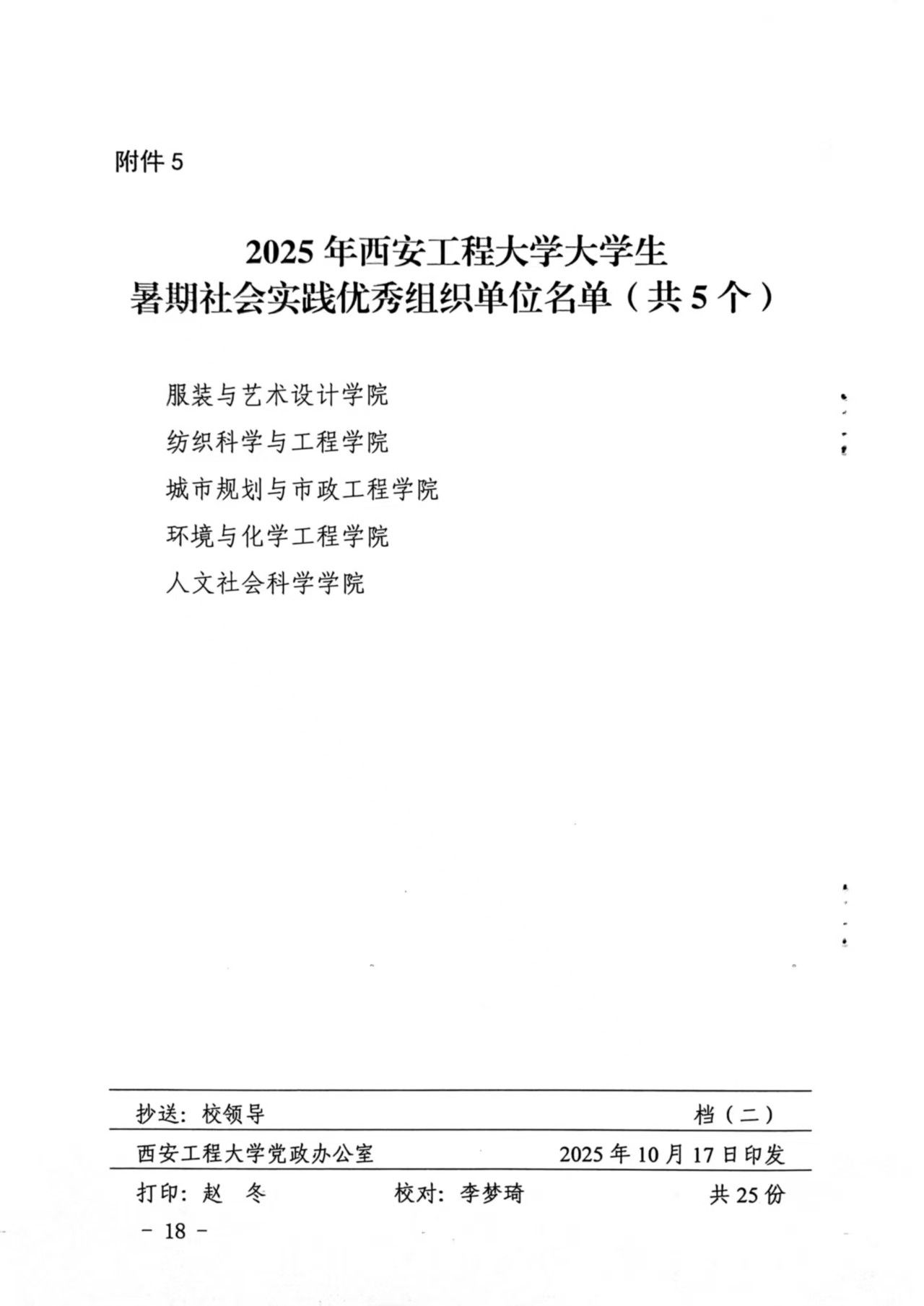 5. 2025年西安工程大学大学生暑期社会实践优秀组织单位名单(共5个)