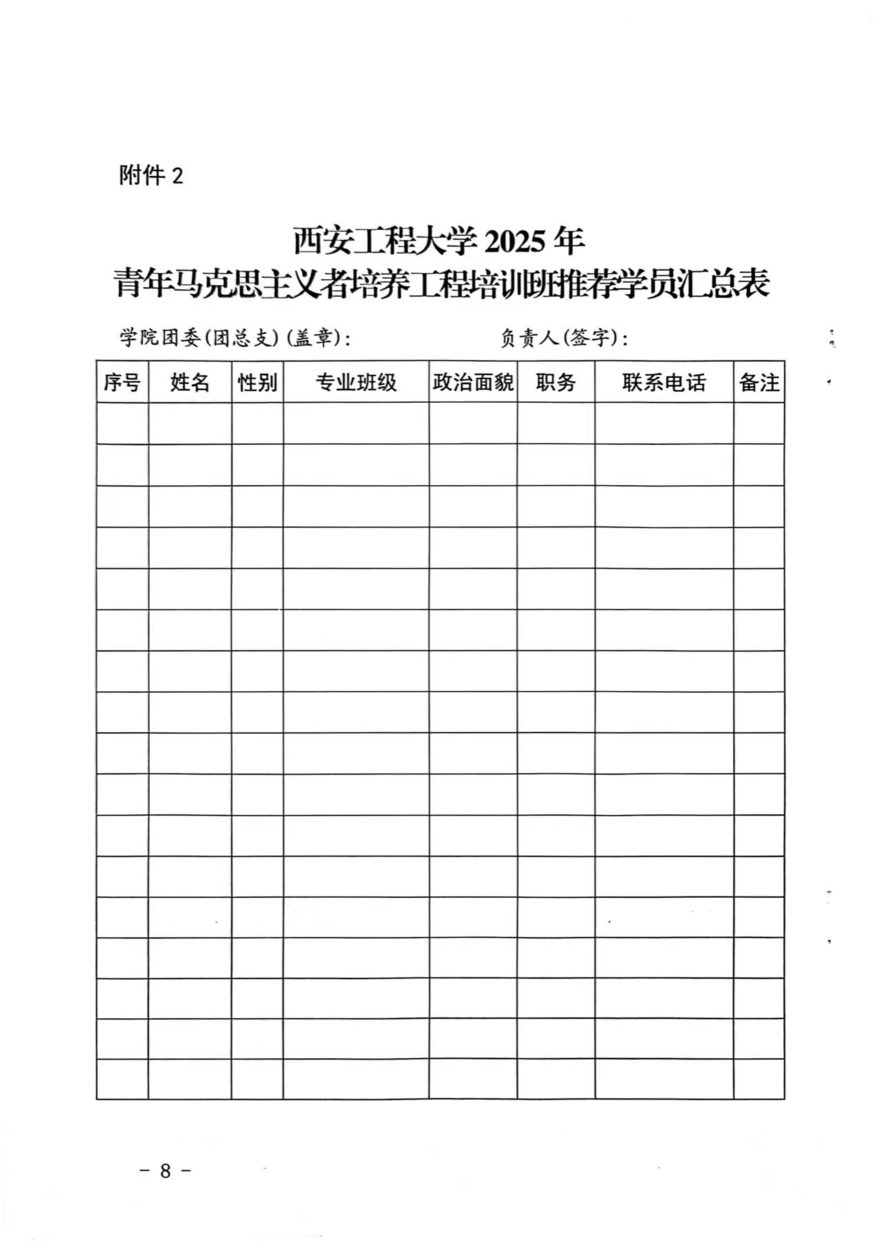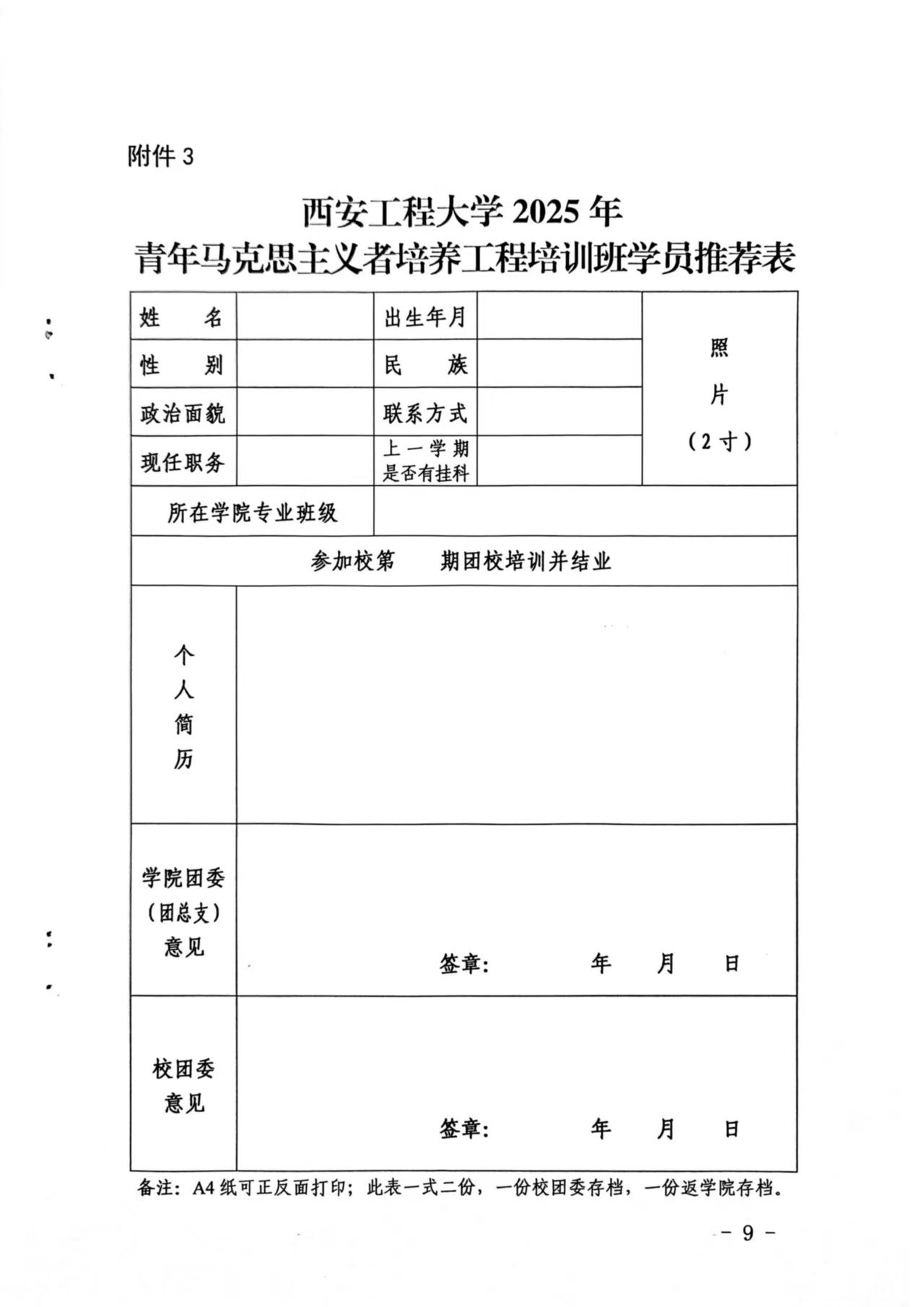 3. 西安工程大学2025年青年马克思主义者培养工程培训班学员推荐表