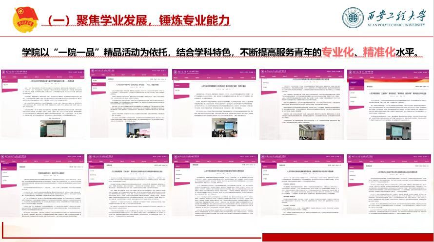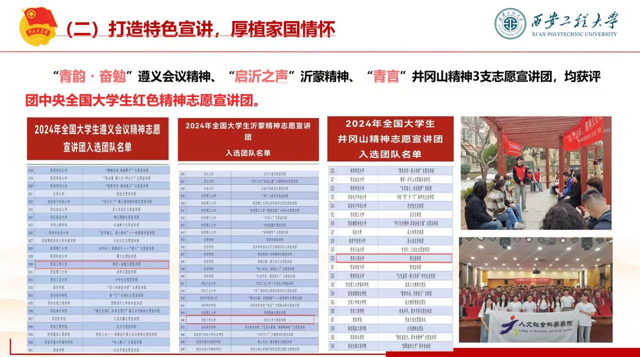 组建的“青韵・奋勉”遵义会议精神、“启沂之声”沂蒙精神、“青言”井冈山精神3支志愿宣讲团,均获评团中央全国大学生红色精神志愿宣讲团,累计走进大中小学校、社区开展红色宣讲30余次,相关事迹被三秦都市报、西安网报道。依托法学专业与大学生法律协会,开展“法律宣讲进社区、进班级”十余场,2025年4月联合骊山司法所开展的法律宣传活动获陕西省教育厅报道。