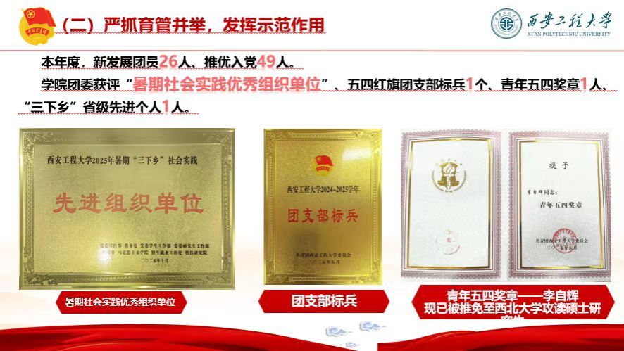 坚持党建带团建,切实为党培养后备力量,2025年度新发展团员26人、学生党员49人,团支部推优入党比例达100%。创新团学干部培养模式,通过主题教育、基层培训提升干部理论水平与工作能力。人文社会科学学院团委获评暑期社会实践优秀组织单位,斩获五四红旗团支部标兵1个、青年五四奖章1人、优秀团干部4人、优秀团员8人、“三下乡”省级先进个人1人等多项荣誉;青马培训学员结业率100%,2名团干获校团干部素质能力大赛一等奖,2名学生分别获省级“学宪法 讲宪法”大赛演讲比赛三等奖、素养竞赛优秀奖;学院辩论队、合唱团、啦啦操队分获校级赛事二等奖、三等奖、三等奖;2名学生挂职临潼区团区委“笃行计划大学生社区挂职”团支部副书记,2人分别在“青年实干家计划”“笃行计划”中,被临潼团区委鉴定为“优秀”。